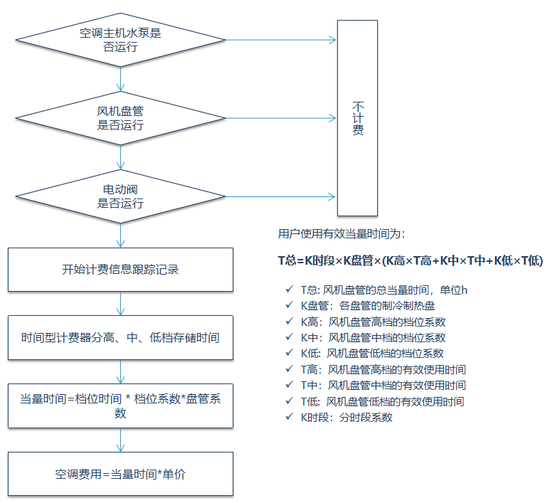 當系統提供制冷或制熱的前提下,用戶電動閥門打開,用戶的風機盤管有效運行,系統開始監控計費。